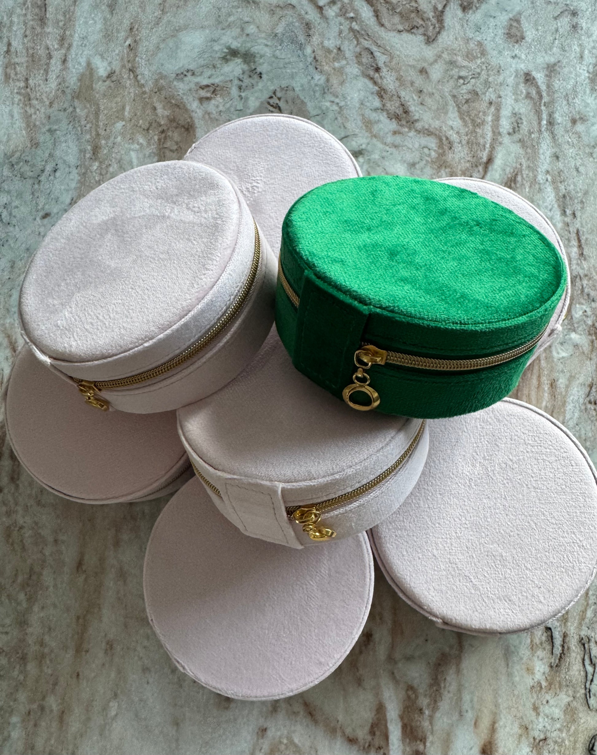 Dette elegante, runde smykkeskrin i dyb emerald green velour er perfekt til dig, der ønsker en kompakt og stilfuld opbevaring af dine smykker. Den mørkegrønne farve kombineret med den gyldne lynlåslukning giver skrinet et eksklusivt og moderne udtryk, mens størrelsen gør det ideelt både til natbordet, håndtasken eller rejser.